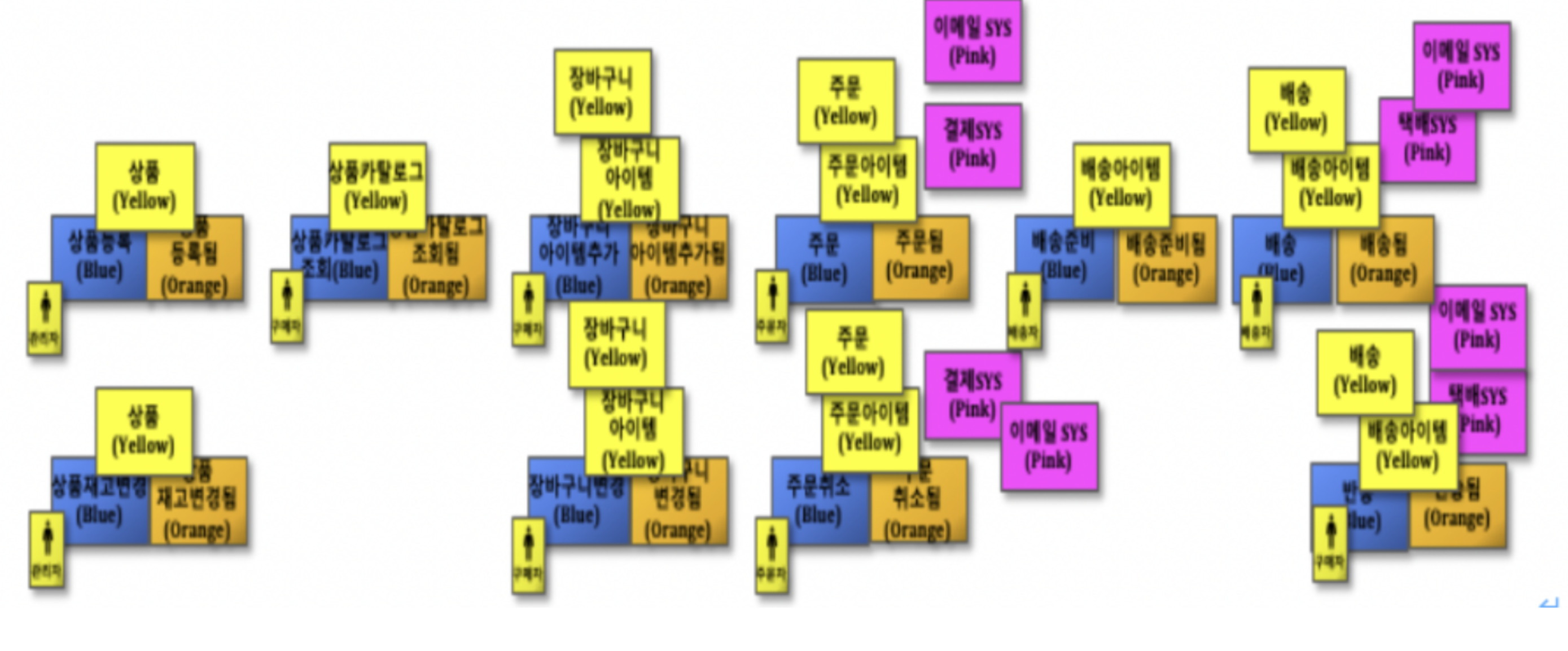 - 커맨드 & 이벤트 발생 시 호출되거나 관련되는 레거시 시스템이나 외부 시스템 또는 장비를 도출하여 핑크색 포스트잇에 작성하여 이벤트의 오른쪽 상단에 붙인다.